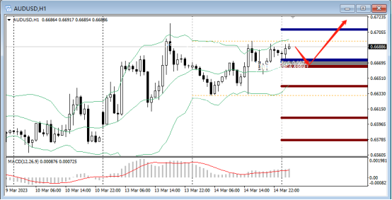 MACD在0轴之上,代表多头意愿强,同时价格运行在布林带中轨上方,预示行情向上的概率大,故而可以采取低多策略,第一支撑位置0.66575,下个目标看向0.67300