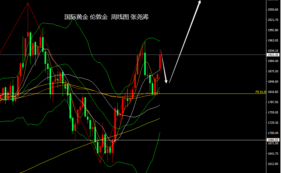 但由于缺口等待回补,周尾多头需谨慎,故此,仍需注意再度回落至5周均线或中轨线支撑之后再度起涨攀升的风险,这也是回撤之后的再度买入支撑点。另外,下方200周均线也在展现出中长期的看涨形态,因而后市也仍有望攀升至两千或者是更高的历史高点。只是在这之前,需要注意一定的回撤空间风险。