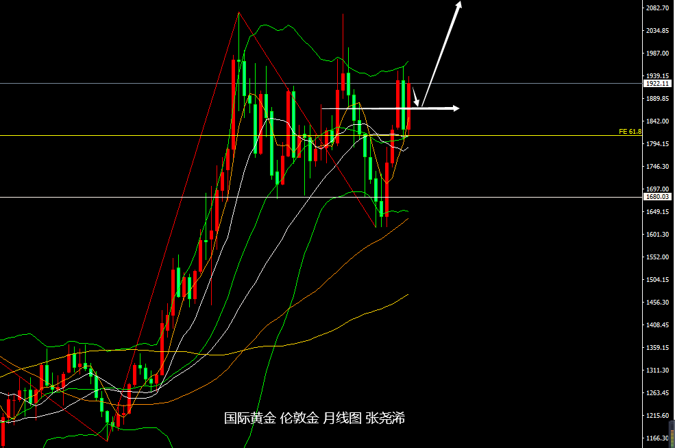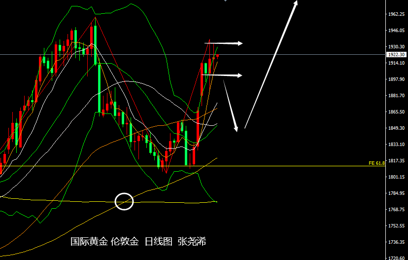 同时,长期方向上,60月均线与100月均线仍保持着高点遇阻后的明显金叉信号,也暗示后市将会再度刷新历史高点的预期,趋向2300-2500美元的展望。短期下方23.6%回撤线及中轨线继续转为看涨支撑。