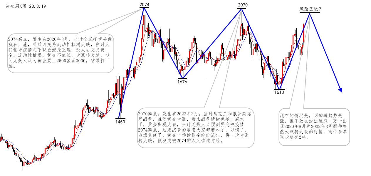 2、根据历史K线图所示,2020年8月疫情期间黄金大涨转大跌,2022年3月树袋熊和乌克兰爆发站争黄金再次大涨转大跌,本次亦如此,各银行破产衍生出来的恐慌情绪推动了黄金的大涨,大涨后必伴随大跌,此时高位追涨异常凶险。