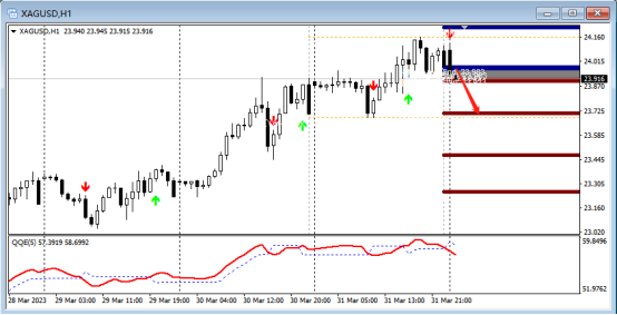 目前QE箭头向下,代表空头强劲,预示行情向下的概率大,故而可以采取高空的策略,可以在15分钟寻找做空信号,第一压力位置:24.100。下方支撑23.690