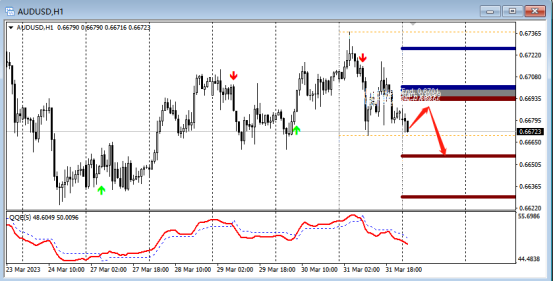 目前QE箭头向下,代表空头强劲,预示行情向下的概率大,故而可以采取高空的策略,可以在15分钟寻找做空信号,第一压力位置:0.67000。下方支撑0.66350