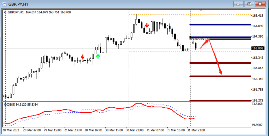 目前QE箭头向下,代表空头强劲,预示行情向下的概率大,故而可以采取高空的策略,可以在15分钟寻找做空信号,第一压力位置:164.420。下方支撑163.000