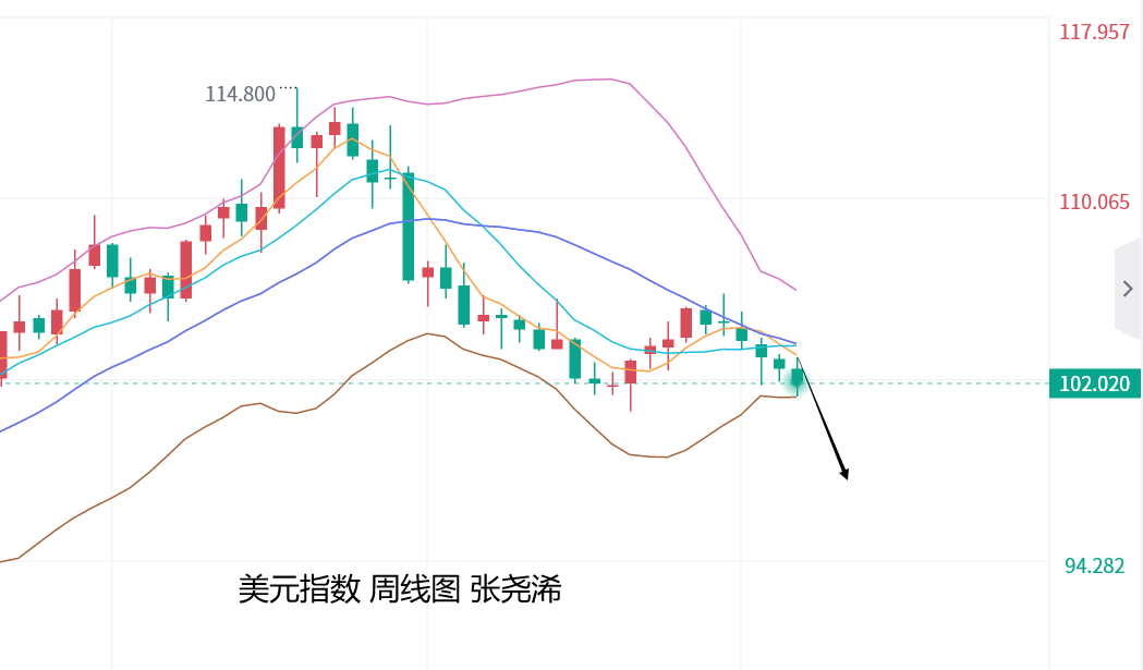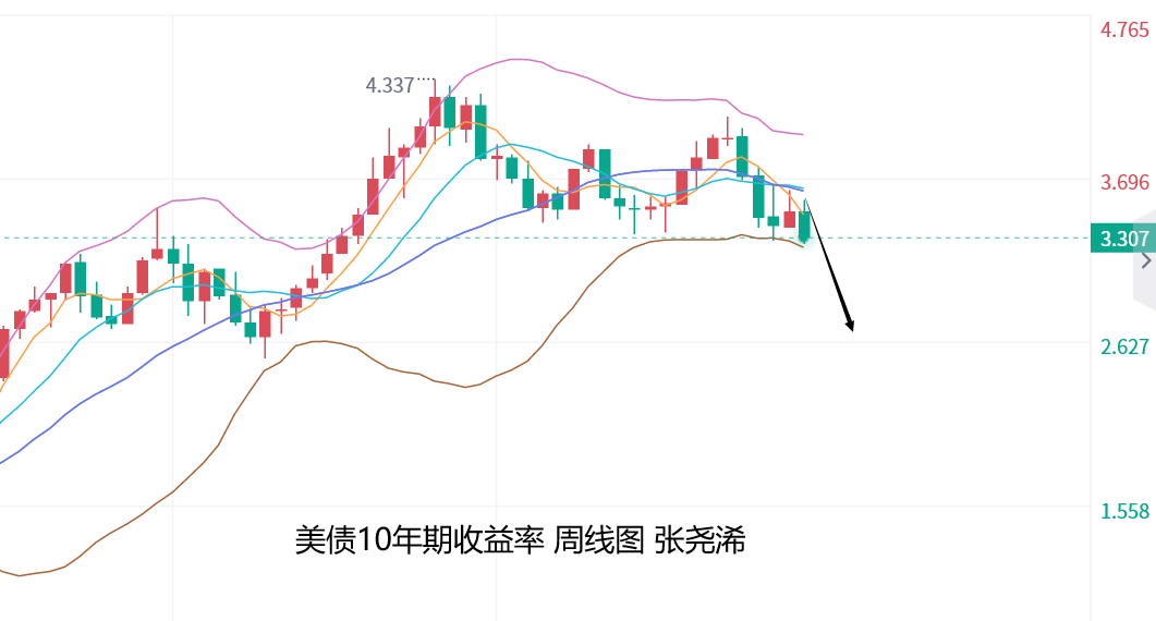 整体来看,美元指数日图有震荡止跌回升的预期,将会对金价产生利空压力,或使金价回落触及短期均线支撑以及中轨线附近,但周图以及月图仍显示美元指数偏空的力度较大,也将产生更大的下行空间,故此对于金价来说,如有回落,在触及中轨附近或30日均线附近,也仍然是可以再度入场看涨至新的反弹高点。另外,美债10年期收益率也亦是如此,故此黄金的上涨空间要比回落空间大很多。