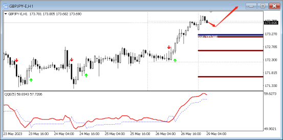 目前QE箭头向上,代表多头强劲,预示行情向上的概率大,故而可以采取低多的策略,可以在15分钟寻找做多信号,第一支撑位置:173.328。上方压力174.692