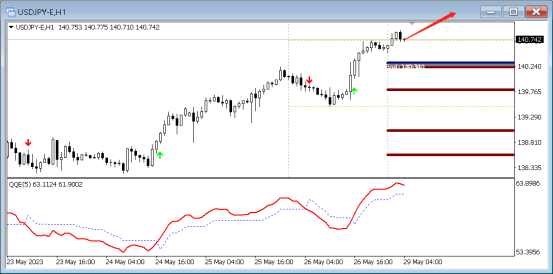 目前QE箭头向上,代表多头强劲,预示行情向上的概率大,故而可以采取低多的策略,可以在15分钟寻找做多信号,第一支撑位置:140.362。上方压力141.511