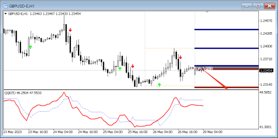 目前QE箭头向下,代表空头强劲,预示行情向下的概率大,故而可以采取高空的策略,可以在15分钟寻找做空信号,第一压力位置:1.23656。下方支撑1.23007