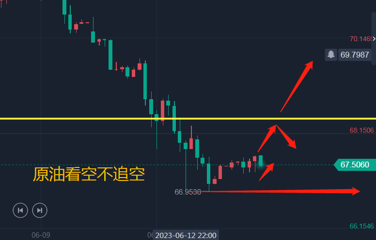 原油昨天整体走势很弱,这是有点出乎意料的,因为按照周线的回补来看,上周收阴,行情确实弱,但不应该直接下跌,应该会有一个反弹的回补动作去71上方再下跌,这样会比较好看,技术面也符合,所以今天虽然看空,但不要去追空,行情随时会反弹回补,而上方的强弱分水岭就是H4的MA10位置,也就是68.6附近,日内不破继续看弱势,上破的话,看震荡调整,或许是慢涨.而行情的小幅出新低也是符合探底回升的走势,所以今天反而想多博反弹,可以小止损试一试,67.1多,防守66.6,看68-68.6上破回撤继续看涨至70!