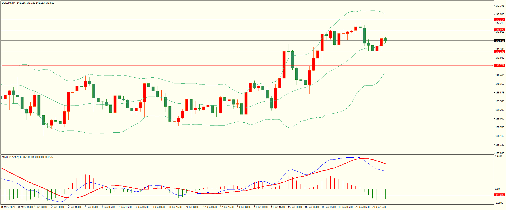 美日昨日亚市开盘后震荡下行,尾盘时段回落至第一支撑展开反弹,日线报收上下影线小阴线,总体来看,日线的多头格局尚未扭转,同时需关注前压力区,预防冲高回落,从4H来看,布林上下轨略有收窄,MACD零轴上方运行,日内下方首要支撑141.20-30,第二支撑140.75,上方阻力141.90,142.30-40,保持在第一支撑上方短线有望回测第一阻力。
