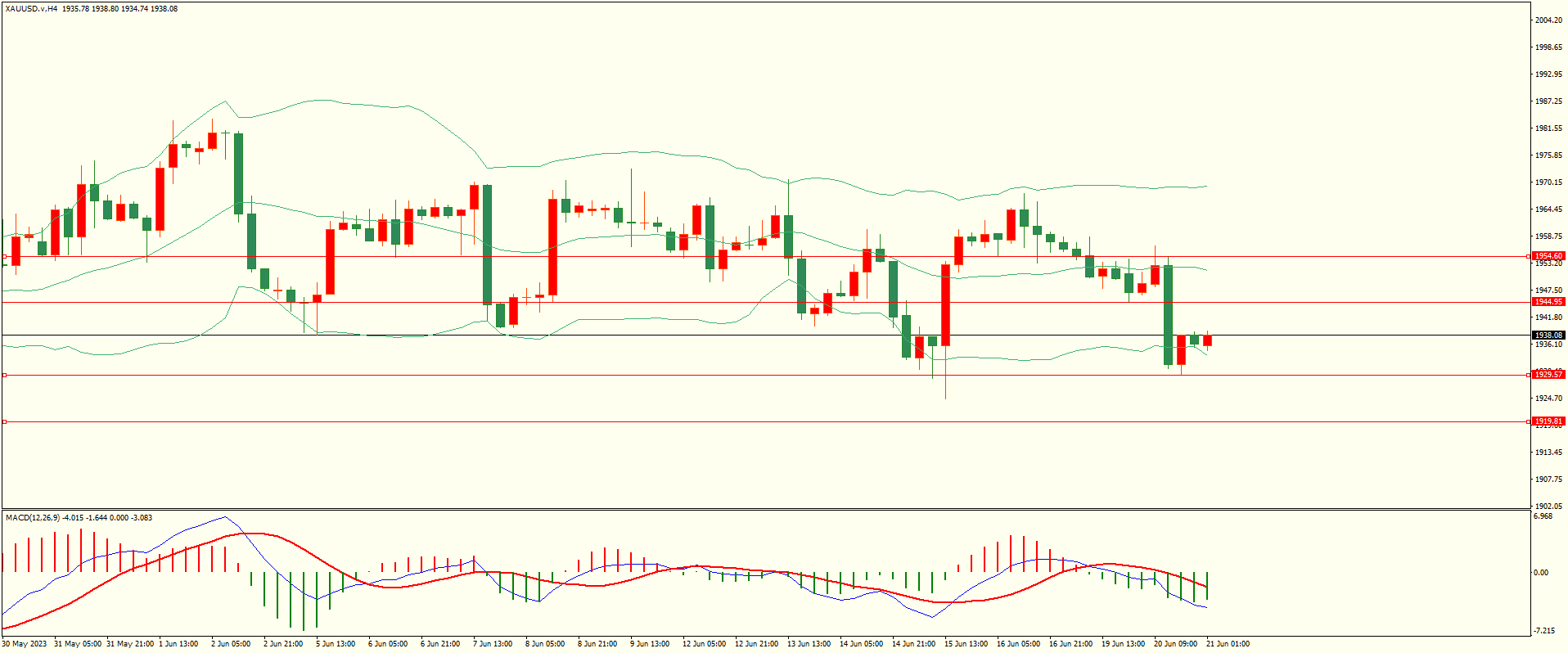 黄金昨日反弹至第一阻力承压下行,纽约盘时段扩大跌幅,日线报收上下影线中阴线,从收盘来看,空头略有占优,目前下方紧邻前低密集支撑区,下破后方可打开下行空间,结合4H来看,布林上下轨略有扩张,MACD零轴附近运行,日内上方首要阻力1944-45,第二阻力1953-54,下方支撑1929-30,1919-20,第一阻力在没有收复前短线有望回测第一支撑。