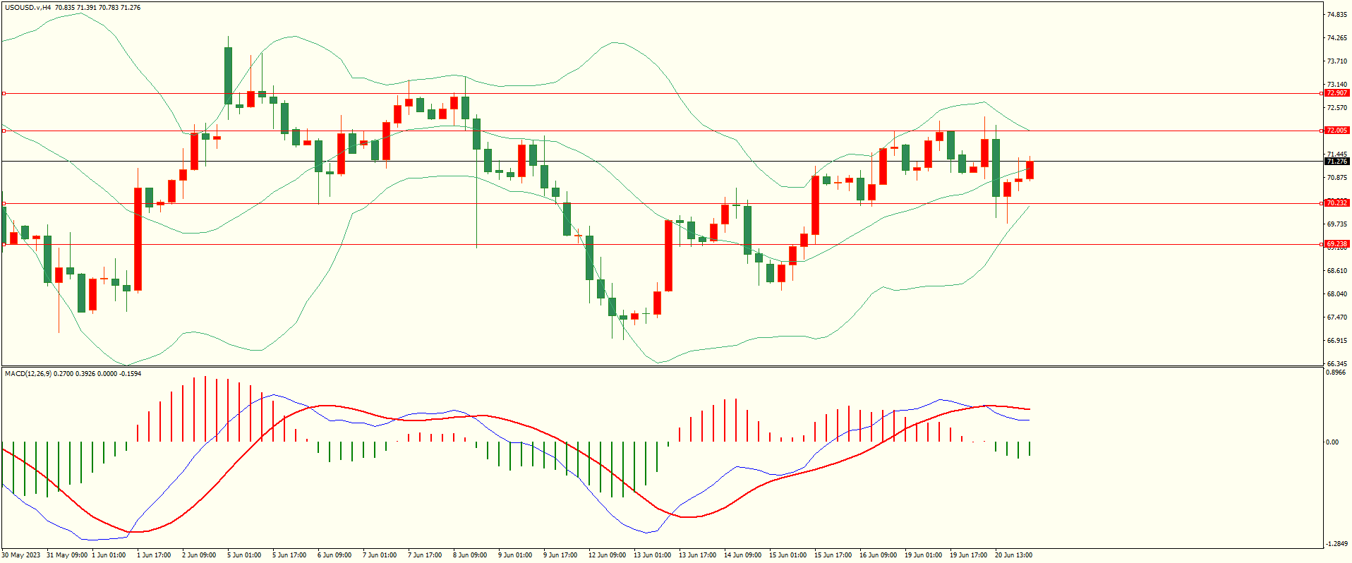 原油昨日反弹至第一阻力冲高回落,盘中触及第一支撑震荡反弹,日线报收上下影线小阴线,日线继续处于多空震荡格局,目前上方临近前高密集压力区,收复后方可继续,从4H来看,布林上下轨略有收窄,MACD零轴上方运行,日内下方首要支撑70.20-30,第二支撑69.25,上方阻力72.00-10,72.90,保持在第一支撑上方短线有望回测第一阻力