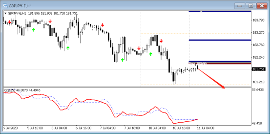 目前QE箭头向下,代表空头强劲,预示行情向下的概率大,故而可以采取高空的策略,可以在15分钟寻找做空信号,第一压力位置:182.228。下方支撑180.674