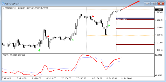 目前QE箭头向上,代表多头强劲,预示行情向上的概率大,故而可以采取低多的策略,可以在15分钟寻找做多信号,第一支撑位置:1.28412。上方压力1.29298