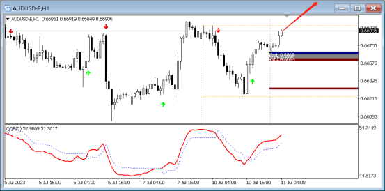 目前QE箭头向上,代表多头强劲,预示行情向上的概率大,故而可以采取低多的策略,可以在15分钟寻找做多信号,第一支撑位置:0.66725。上方压力0.67436