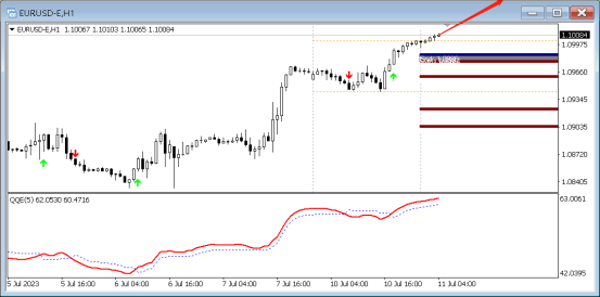 目前QE箭头向上,代表多头强劲,预示行情向上的概率大,故而可以采取低多的策略,可以在15分钟寻找做多信号,第一支撑位置:1.09823。上方压力1.10582
