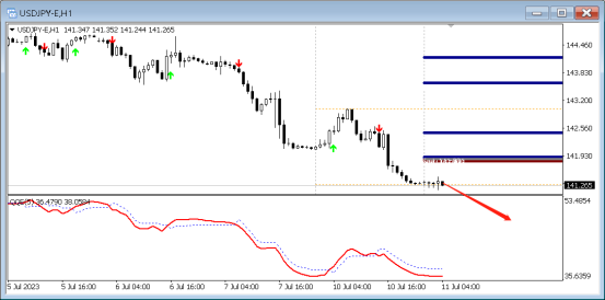 目前QE箭头向下,代表空头强劲,预示行情向下的概率大,故而可以采取高空的策略,可以在15分钟寻找做空信号,第一压力位置:141.835。下方支撑139.854