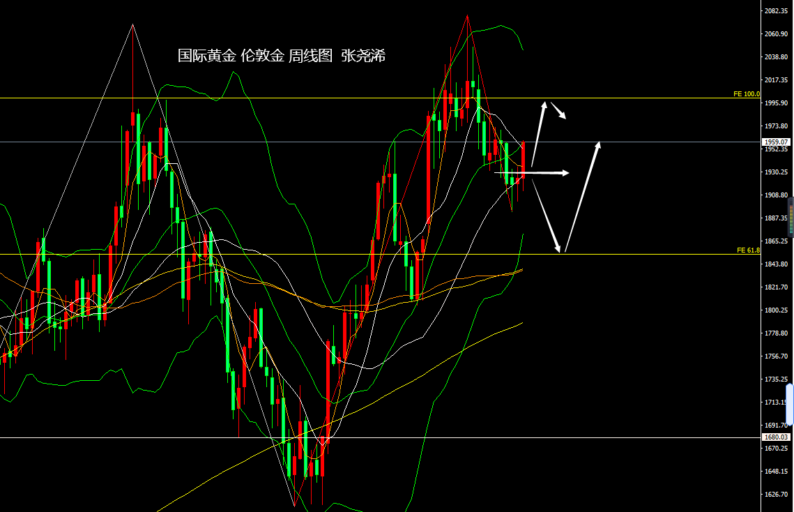 周线级别:金价本周在前两周收取的触底回升止跌看涨形态下,继续触底回升走强,目前在突破5周均线阻力后,也进一步如期突破10周均线阻力,且看涨动力仍然持续,附图指标MACD看跌动能柱持续缩减,KDJ已转为金叉向上发展,目前也在测试中轨线阻力情况,如持稳突破,后市将进一步看涨至2000美元关口,否则将有回落需求,但回落不破转为支撑的5周均线,则仍有再度走强的前景。