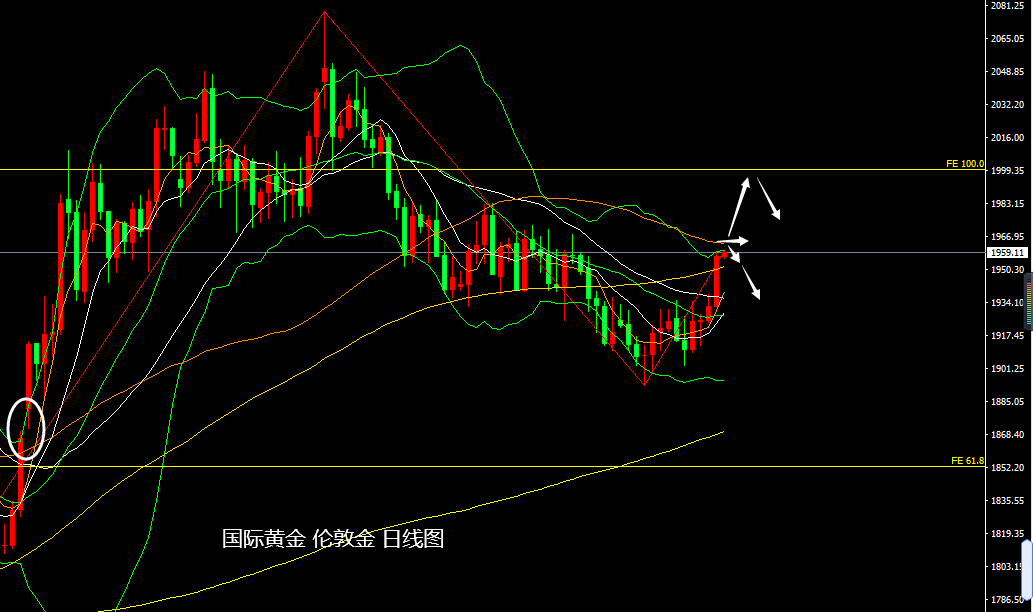 延续到美盘时段,多头开始发力,并连续大幅攀升,且突破100日均线阻力,直到次日凌晨1点左右录得日内高点1959.21美元,但此时反弹动力有所减缓,并最后维持窄幅盘整持稳模式,最终收于1957.10美元,日振幅27.15美元,收涨24.99美元,涨幅1.29%。