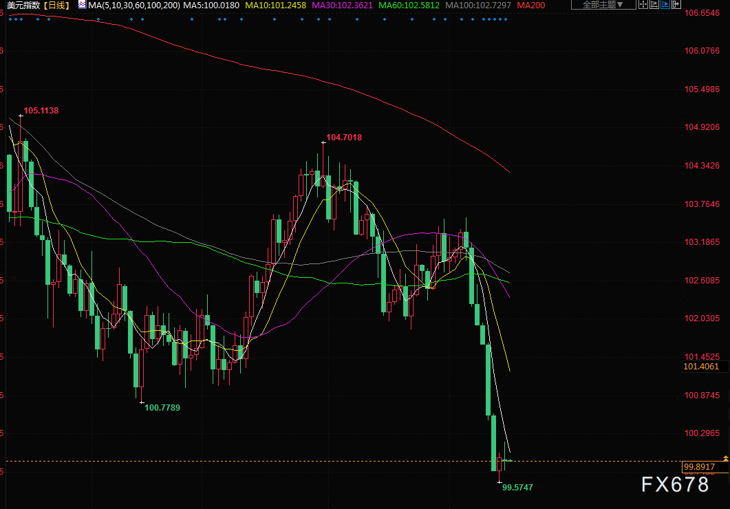 美元指数盘尾下跌0.12%,报99.832,上周五曾触及99.574的2022年4月以来最低。欧元上涨0.14%,报1.1242美元,稍早一度触及1.12445美元的2022年2月以来最高。