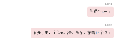山水比德 犹豫下没上,错失了大肉,估计让大伙看笑了一整天,然后手里还拿着个7个点肉垫的熊猫乳品,早上一走弱就有小黑说,看吧,熊猫被套了吧: