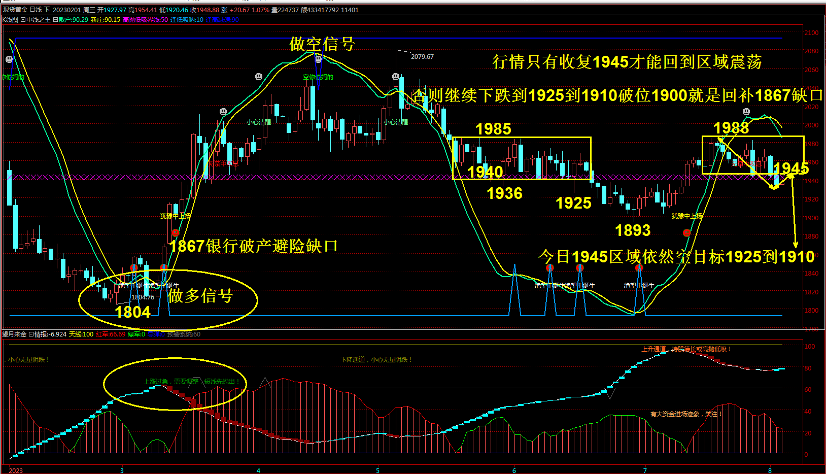 昨日白银黄金同时破位,说明新一轮调整随时开启。上周黄金下跌,然后反弹留下高开的1945缺口,经过避险拉升最终没有让多头持续上涨,再次回补1945位置,顶底转换这里就是第一压力位置,熟悉盘面都是清楚左右两测都是1940到1985宽幅震荡,昨日破位下轨,就是说横盘整理以后选择空头趋势,你要做的就是顺势反弹做空,除非多头再次收复1945区域,才能再次回到前期震荡区域,本次黄金无论是避险还是在持续买盘,都不如从前,今日反弹顺势做空,下面支撑集中1925和1910区域,破位这里打开下跌空间。当然3月银行破产倒闭的高开1867依然没有回补,这样不能夯实底部,自然多头难以走的更远,缩回的拳头再次出击才有力度。综合上述操作思路如下:压力:1975----1990支撑:1945---1925