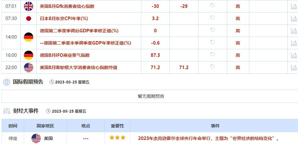 8月24日,2023年杰克逊霍尔全球央行年会举行,主题为“世界经济的结构变化”。投资者需要关注各位官员的讲话,可能对未来政策制定或市场走势造成影响。⑤8月25日(周五)关键字:日本8月CPI,德国8月IFO商业景气指数
