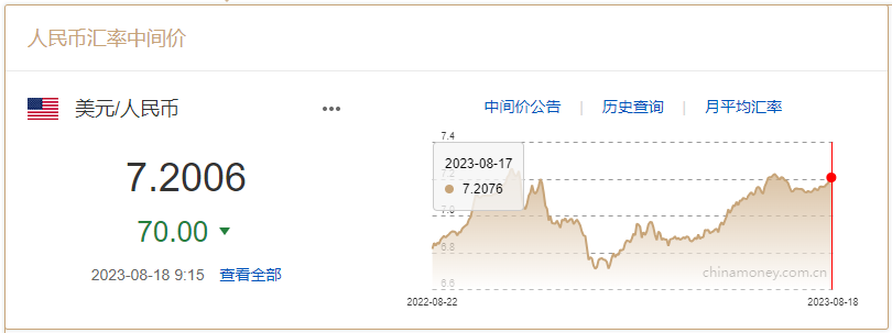 8 月 17 日,人民币兑美元中间价报 7.2076,最新中间价报 7.2006,调升 70 个基点,本周累计调贬 419 个基点。