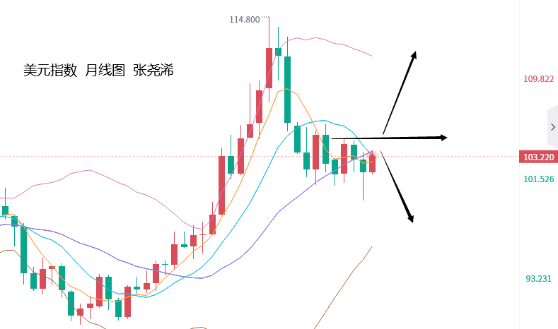 整体来看,美元指数目前反弹动力减弱,有回撤的迹象,并也遇阻月图中轨线压力,短期预将走出震荡区间波动,但如突破中轨阻力,则再度开启攀升模式,因而本周对于金价的提振,也因谨慎对待,仍需重点关注周五鲍威尔在杰克逊霍尔年会上的讲话,或打压美元指数加大遇阻回落力度,并对金价产生支撑,也或再度维持鹰派观点,令金价再度转跌回落。