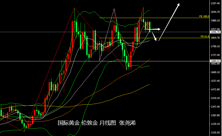 技术上:月图级别,金价目前虽未完全打破近几月维持在1990-1890美元的震荡区间底部支撑,但10月均线暂仍展现出阻力的压制,如本月收线仍维持在此均线下方,则后市仍将继续看回落触及布林带中轨或30月均线支撑附近;