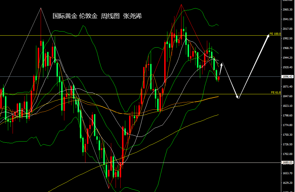 周线级别:金价上周继续回落收跌,连续第四周走低。虽然本周有所止跌回升,但布林带仍偏向开口向下散发,主图短期均线保持死叉向下,附图指标MACD空头信号处于增强阶段,KDJ保持死叉运行,空头力量仍仍占据优势,暗示后市仍有继续走低的动力和空间,下方将觊觎填补3月份缺口,以及将看好触及61.8扩展线的1852美元附近目标,故此反弹关注各均线阻力力度仍可看空回落。