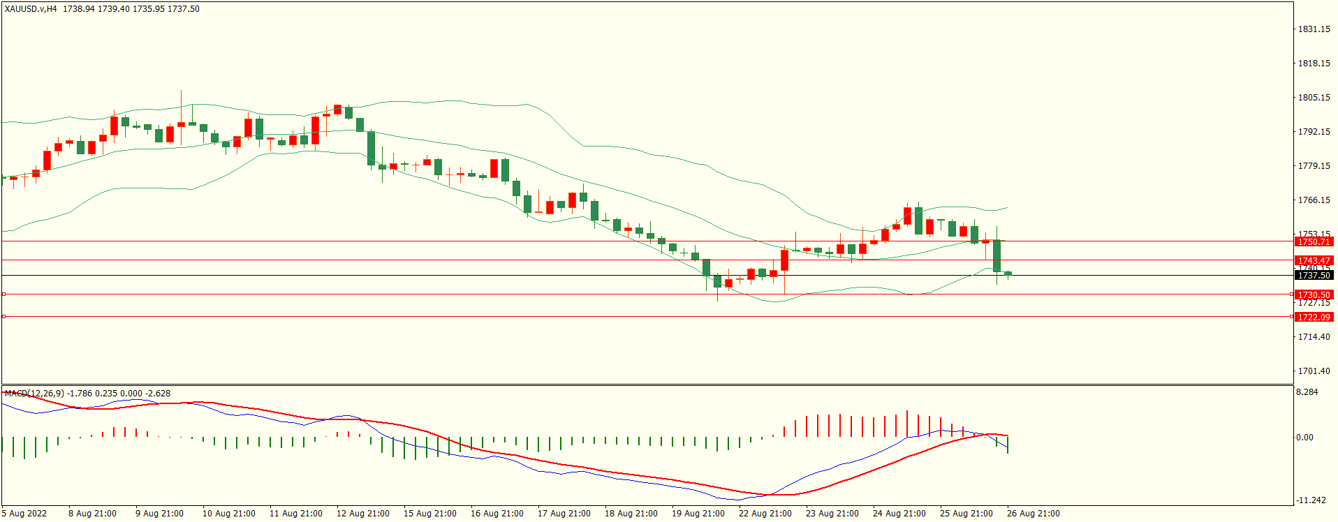 黄金上周五亚市开盘后震荡下行,盘中在利空因素打压下扩大跌幅,日线报收下影线中阴线,从收盘来看,空头动能继续增强,日内有走低迹象,结合4H来看,布林中轨拐头向下,MACD零轴附近运行,日内上方首要阻力1743-44,第二阻力1750-51,下方支撑1730-31,1722-23,保持在第一阻力下方短线有望继续测试第一支撑。