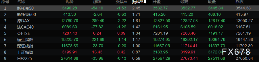 欧洲其他两大主要股指方面,法国巴黎股市CAC40指数报收于6093.22点,比前一交易日下跌74.29点,跌幅为1.20%;德国法兰克福股市DAX指数报收于12760.78点,比前一交易日下跌289.49点,跌幅为2.22%。