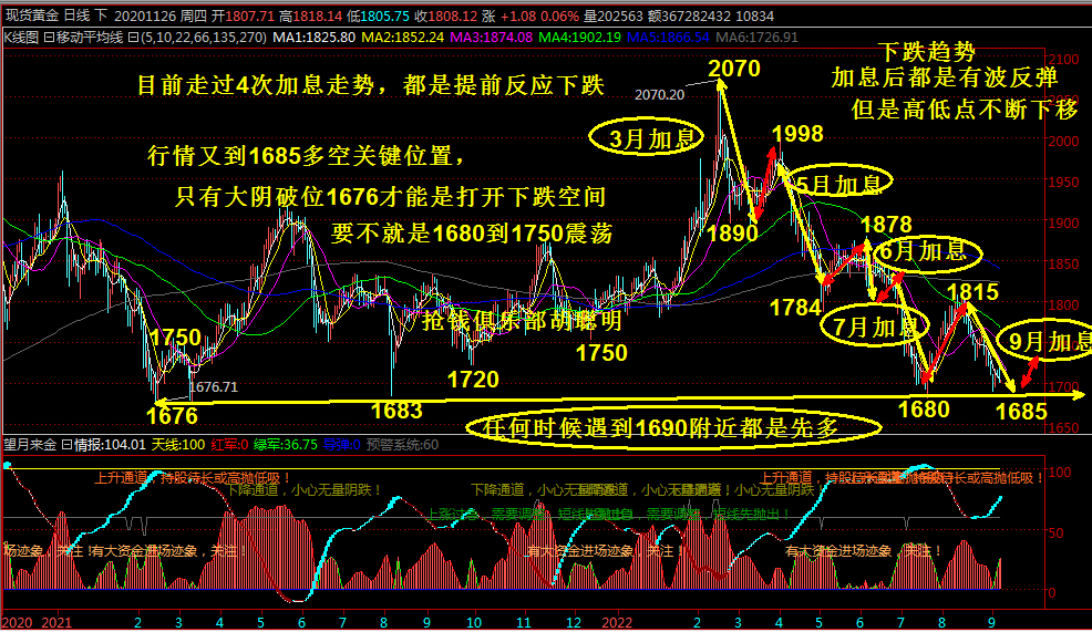黄金最近行情基本围绕均线反弹进行,目前5到10均线支撑上移1710到1715区域,也就是说本周不破1710区域还是继续反弹,当然下周三加息就是来了,只有最后一跌鞋子落地加速赶底最后一跌才能有大幅反弹,毕竟现在看技术下跌不变,基本面行情还是美联储加息不变利空,在有ETF最近2个月在每次反弹行情都是不断减持黄金,说明对后期也不看好。所以这个时候一定注意一点不要追涨杀跌,黄金现在仅仅是反弹行情。没有人比我们更了解做空,没有人比我们15年更了解大选走势。你自己慢慢想大选时候,要想当局连任,那么是不是经济数据要好看,同时通胀生活成本下行同时就业必须充分,企业制造业回流是不是补助破天荒,同时对外吸引资本回流接盘,以及背后金主财团资金回流推波助澜,是不是这些在美元,米股,米债,三者之间有一个牛市品种,谁你想想就是明白,这些必须要美元保持强势,不能失去结算倍储备货币的信用低位,如果这些失去,那么自然收割全球和掠夺财富的筹码就没有了。所以最近黄金举步艰难,更多是美元强势还有就是资本大幅撤退导致,金九银十后期黄金企稳白银工业需求加大,自然后期白银涨幅都是会大于黄金,甚至下一个商品牛市就是白银,黄金历史新高到了2074,石油乌克兰危机自负45一路到130区域,但是白银相比历史新高45一直还没有再次测试你懂的。综合上述操作思路如下: