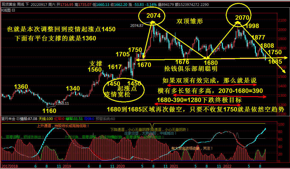 黄金月线大双顶能不能成型。那就是看10到11月大选结果,什么时候加速大跌,就跟当年黄金避险大涨加速赶顶一样才能变盘,如果变盘那就是底部区域来回过山车大波动,才能引起多空分歧,像这样温水煮青蛙行情没有大波动。其实稍微熟悉盘面都是应该清楚,本次宽松自1450上涨的,当美联储全球货币政策转向开始抑制通胀和资本外流,那么黄金牛市不在,而且经历前三次加息你应该清楚,2070是乌克兰危机避险拉升的高位,随后3月加息黄金回到2000横盘,4月加息黄金回到1900时代,5月和6月加息回到1800时代,7月加息1700时代,那么9月加息100基点又到1600时代,那么剩下还有11月和12月加息自然黄金震荡下跌主旋律,但是经过昨日大跌1680是不是有效破位那么只有看能否三天收盘1680下,按照以前四次加息走势,都是周五有大幅反弹,然后下周一和周二震荡下跌,周三等加息鞋子落地,开始兑现利空后最后一跌反弹到下个月加息。那么如图现在可以清楚看到破位1680下面唯一有横盘整理的区域,就是1560到1617区域,其次就是1640位置,那么今日操作就是很简单,惯性下跌第一次1640肯定是可以博弈短线做多,当然中线不要着急,毕竟现在刚破位2年的支撑,惯性和恐慌都是有继续延续弱势,那么期待多头反击的一定下周三加息以后,看加息幅度和美联储主席讲话,从中找到11月12月加息幅度,这样市场充分消化,黄金才能聚集人气反弹,自2070下跌通道压力集中1750位置,也就是说后期如果不能突破这里,还是反弹继续震荡下跌,当然连续下跌很多人没有经历1280甚至1450上涨行情。因为从业不到2年,自然不知道2年以上黄金价格,所以一定敬畏市场,消息利空,技术破位空,全都是这样弱势,你要做的就是开盘价格反弹15到20美金做空顺势进场,不要去逆势做多,甚至去补仓,什么时候四小时出现绝望诞生做多信号,或者日线出现大阳以后,二次回测参与做多更安全,现在交易都是看4小时周期,四小时收盘K线大阳10美金左右,或者长下影线8美金左右才是说明多头进场,你才可以多切记。综合上述操作思路如下: