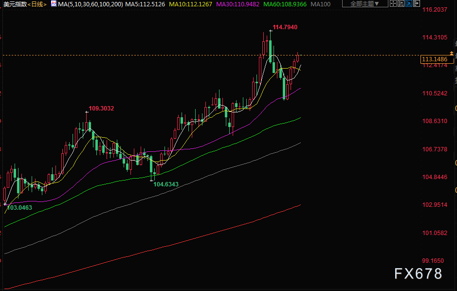 纽约尾盘,美元指数上涨0.3%,报113.14,脱离了上周触及的110左右的低点,并向上月触及的20年高点114.78爬升。欧元兑美元下跌0.4%,报0.9705美元。