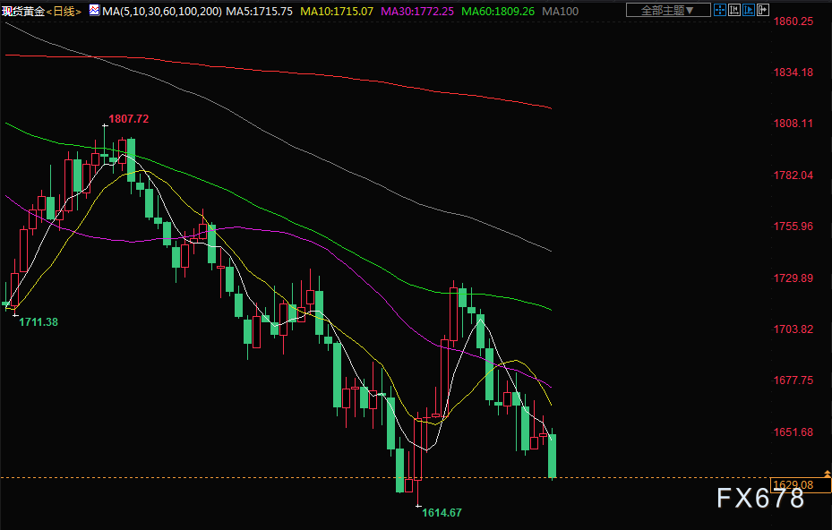 金价周三下跌超过1%,至三周低点,因为美元和美债收益率上升,美联储激进加息的前景进一步打压金市。现货金下跌1.5%至每盎司1627.81美元,此前在盘中早些时候触及9月28日以来的最低点。