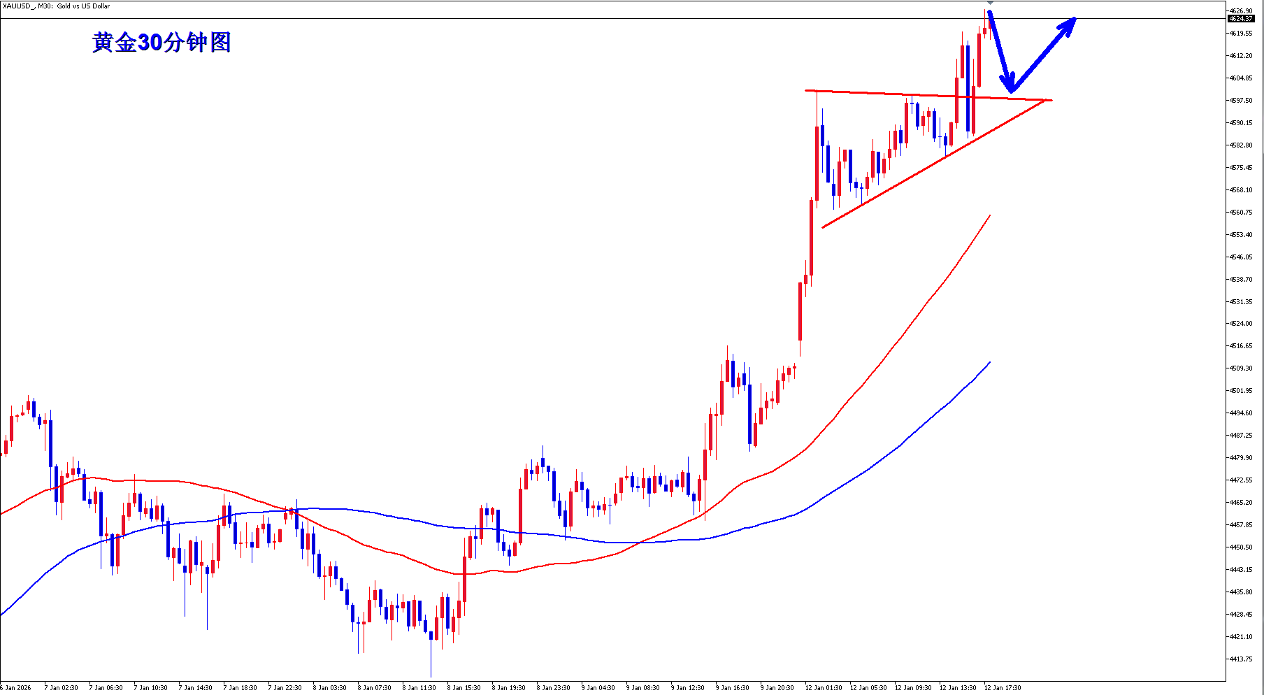 黄金30分钟图均线继续金叉向上的多头排列,而且黄金30分钟经过上升三角形调整之后,直接向上继续发力,黄金多头继续势如破竹,黄金短线4600一线形成支撑,黄金短线回落4600一线支撑之后还是可以继续逢低继续多。