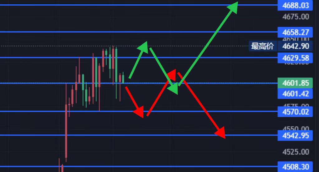 第一步:4634-40间择位空,46-52补仓,备出一个仓位,止损7个点,目标回调日内20-30-50%依次下看;