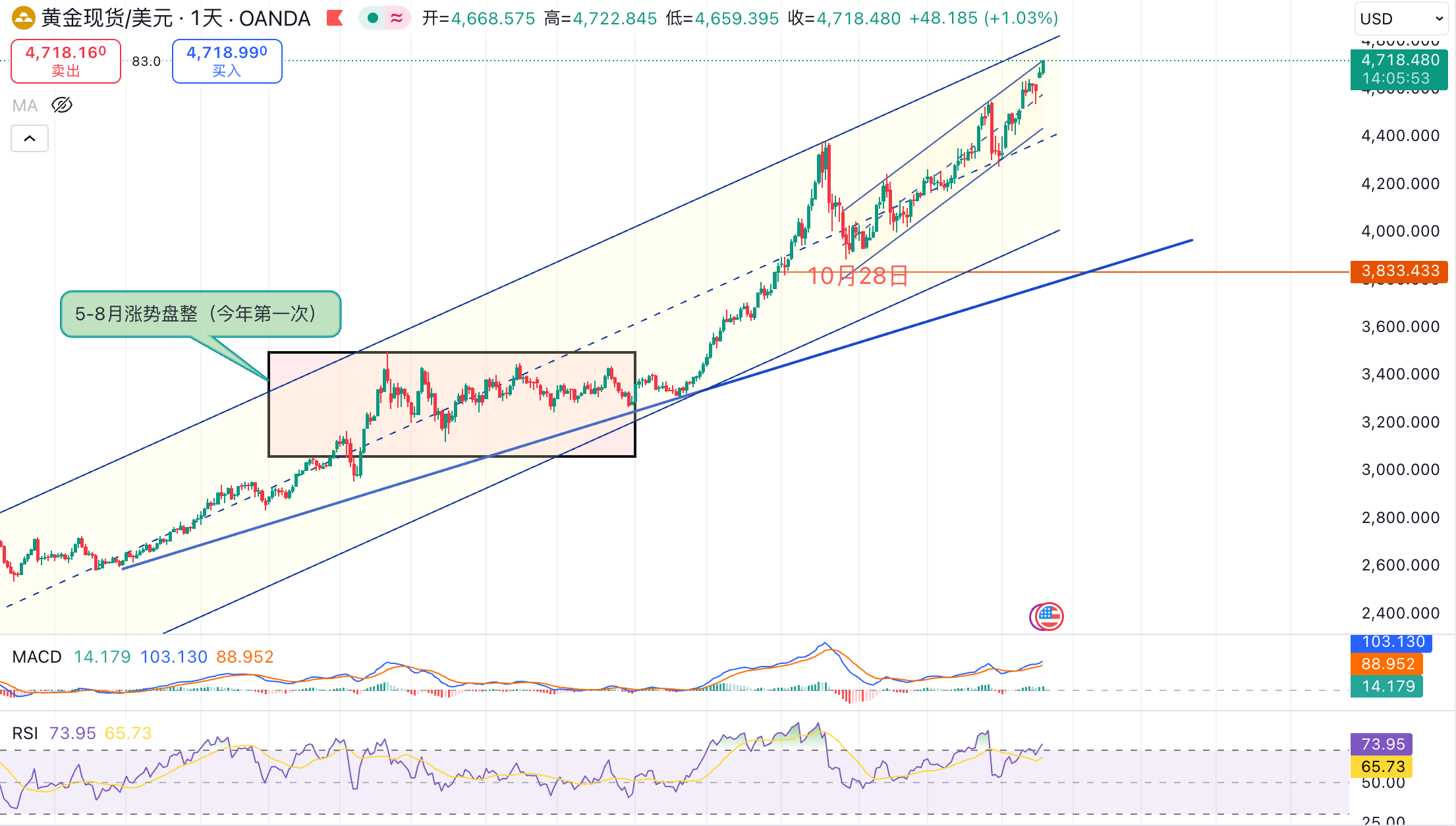 黄金站上4720美元后,趋势依然强势,长期上涨空间远未见顶。
