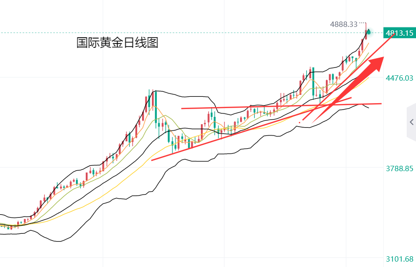 从之后的走势看,周三亚盘开盘后,黄金小幅回落至4657美元后,很快企稳突破4766美元,继续刷新历史高位,最高涨至4888美元,逼近4900美元整数位置,遇阻后黄金回落4832美元企稳,美盘开盘时反弹4880美元遇阻,此后黄金震荡回落,盘中一度跳水急跌近100美元,最低跌至4756美元,回吐日内全部涨幅,不过金价很快企稳反抽,收盘前重回4800美元上方。总体来看,黄金再创历史新高,比我们的看涨预期表现更加强势。