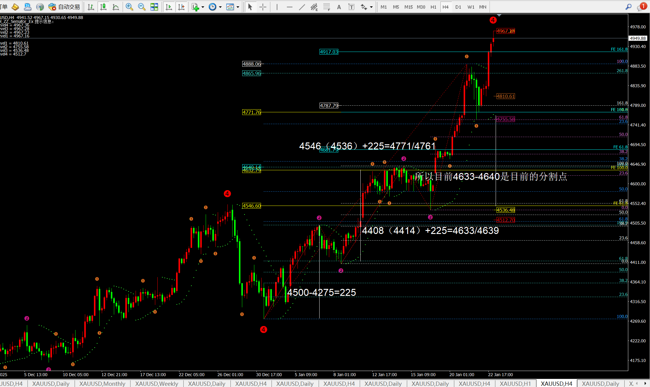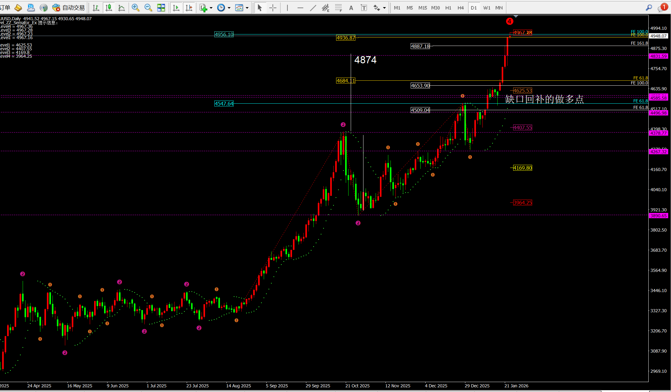 ① 日线昨日大阳拉伸170美金,而日线指标macd金叉放量,灵动指标sto超买运行,代表日线还是多头走势。当前支撑在均线MA5附近4831一线。从日线的斐波拉契扩展线看目前支撑4887一线4936一线,短期阻力4956附近。