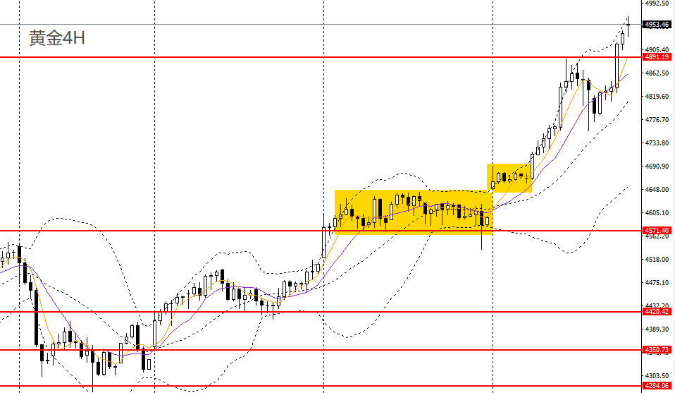 黄金连日走高,站上日线布林上轨,日线RSI到达超买区,4小时升破4900大关,上行空间打开,4930附近企稳可继续进多。黄金/人民币如于1103一线企稳可进多。