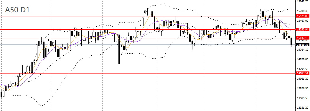 A50持续阴跌,仍承压于5日均线,4小时处于关键支撑14800,短线走势疲软,15000关口如继续承压可进空,短线预计将下探14500附近。
