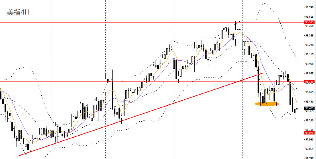 美元指数收复周三涨幅,日线RSI位于50之下,4小时未能升破99关口,且再度跌破98.70一线支撑,短线有望回踩98-98.20一带。