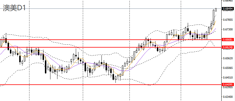 澳美收大阳柱,一举站上0.68大关,日线RSI到达高位,4小时升破0.6840一线压力,多单仍可持有,后市预计将挑战0.6870附近。