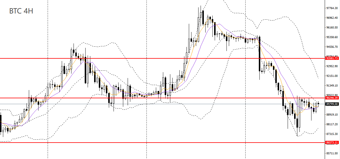 比特币小幅收跌,日线RSI位于50下方,4小时空头动能减弱,仍徘徊于90000关键节点附近,如继续承压于下方,后市预计仍将回踩84000-86000一带。