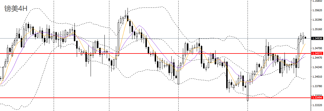 镑美昨日强势拉升,上破日线布林中轨,4小时站上1.3450一线压力,短线趋势转强,如回踩1.3480附近企稳可进多,如彻底站上1.35,可继续看多至1.3530。