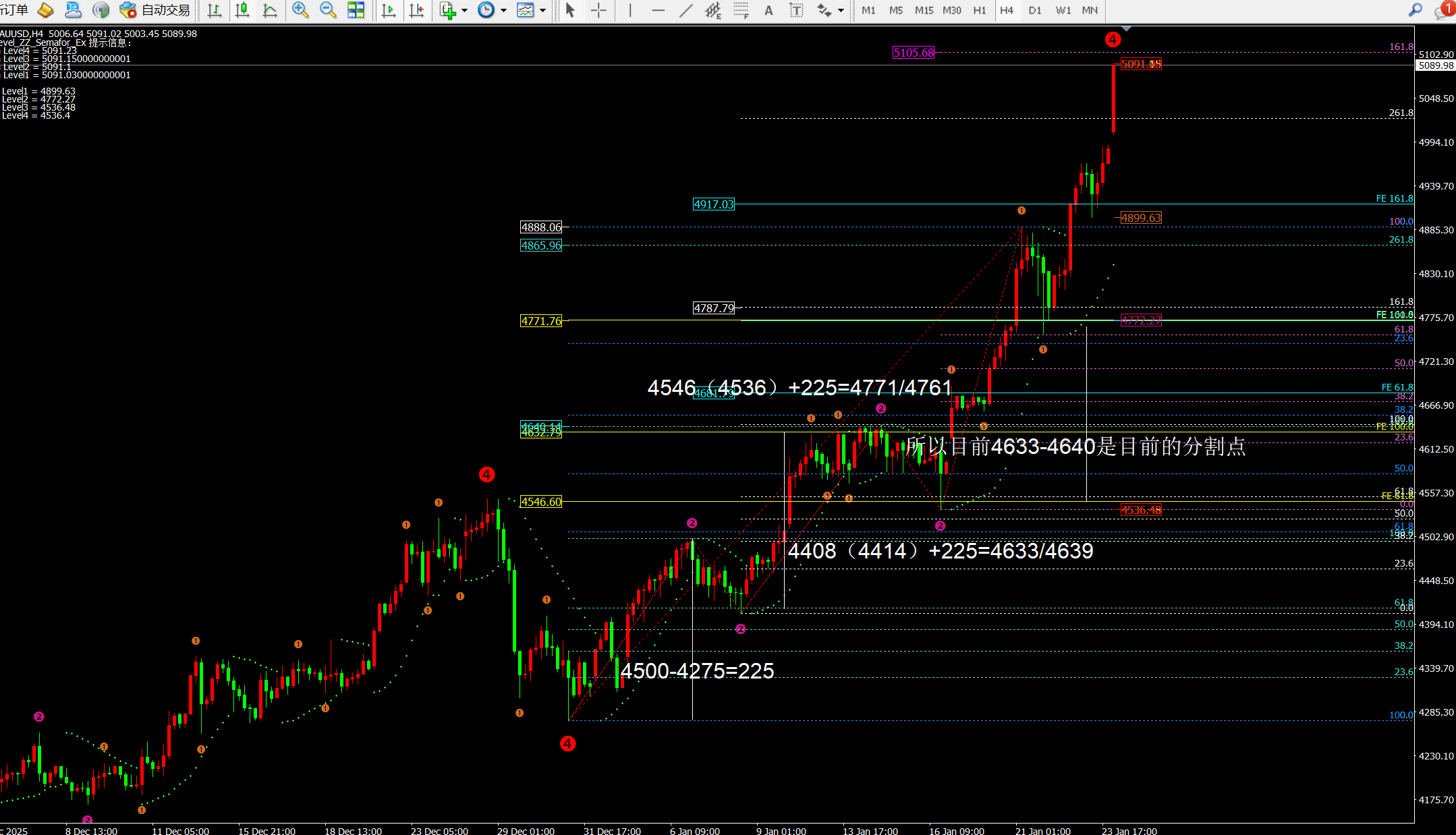 综合而言:目前上方关注5097-5105一线阻力;价格持续上涨目前多单只能在5055左右去多一次,其次是缺口修复后的4957附近。而目前小时新持续拉伸,所以多单没机会。而价格出现回落后在参与会有一定的风险。今日日内关注5036一线的支撑即可,而空在5100附近。