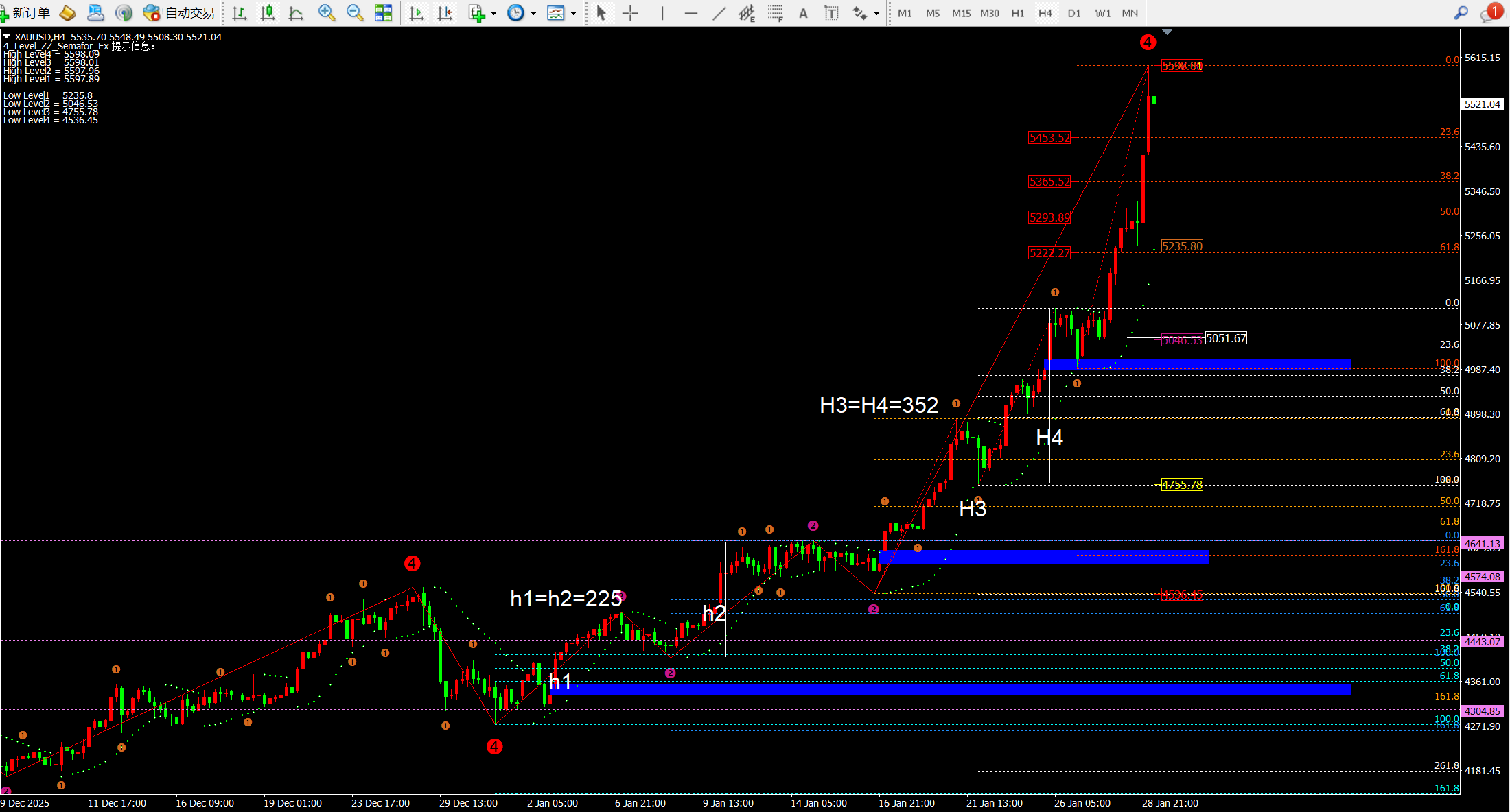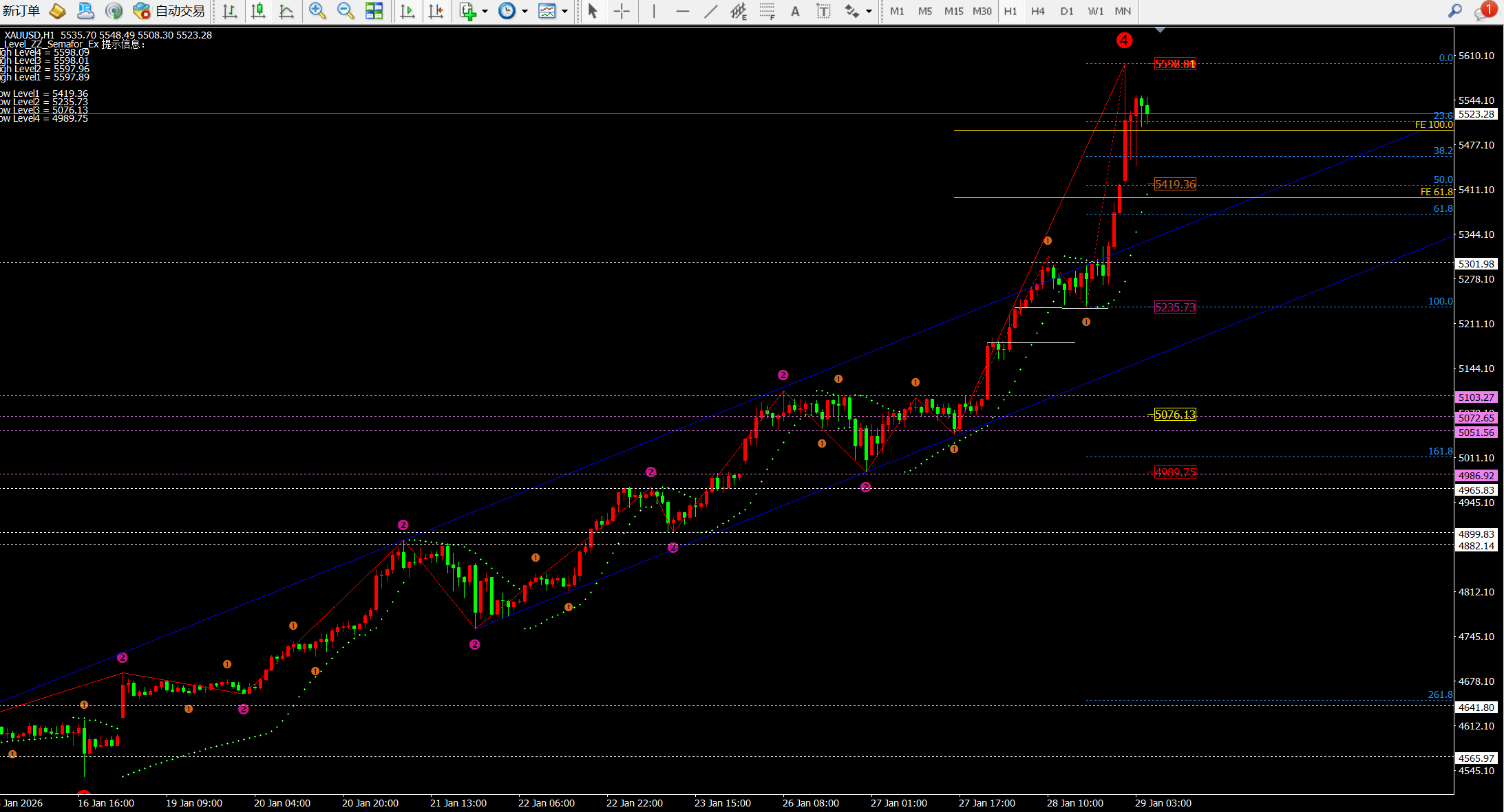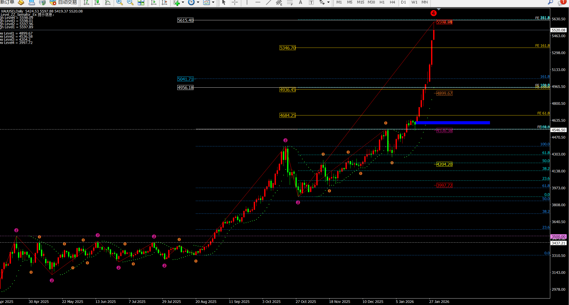 ② 而根据日线斐波拉契扩展线看目前1.618位置位于5616-5622附近;早间的一波拉伸直接到达高点附近。并且日线这波从4550-5600已经大于1000美金,因此出现回落也将是恐怖级的。