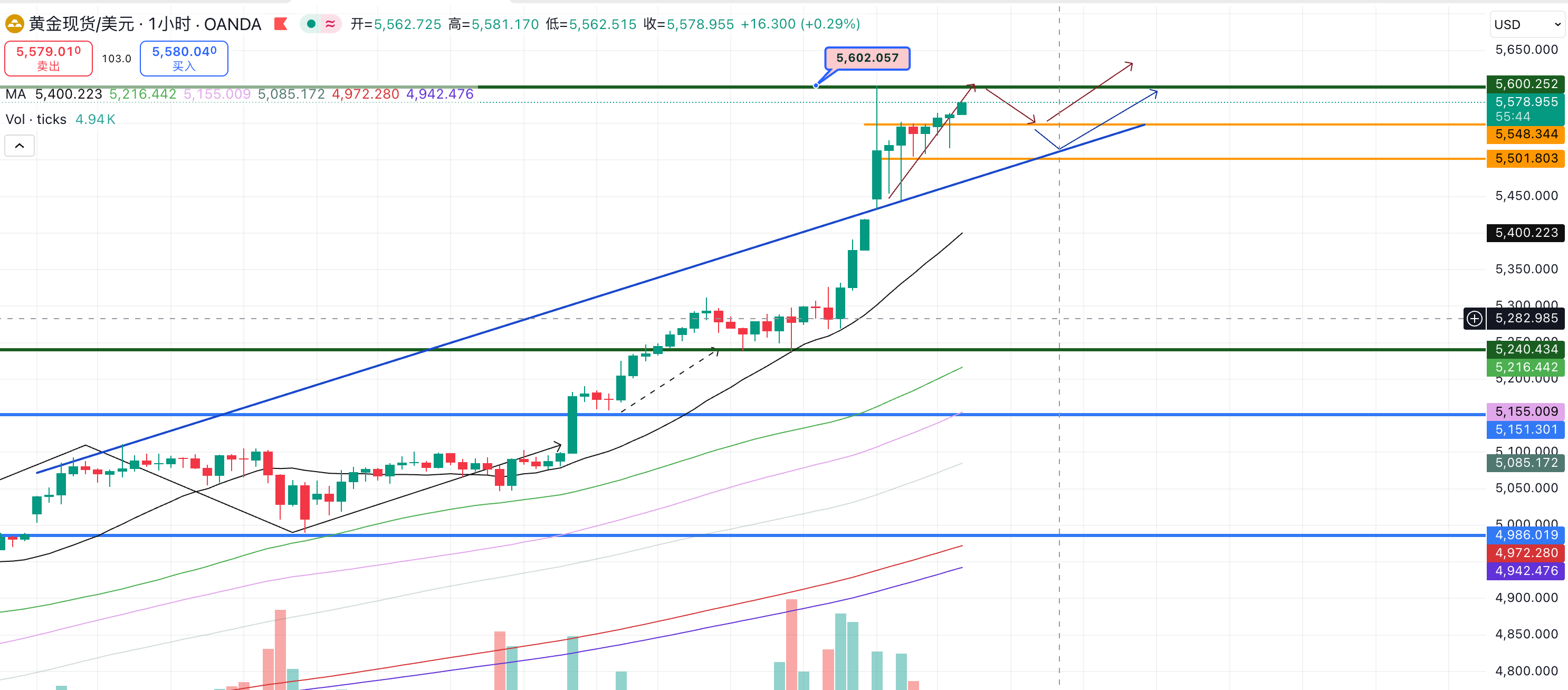 周四早盘,金价一度触及 5596 美元/盎司,多头情绪依旧占据主导。